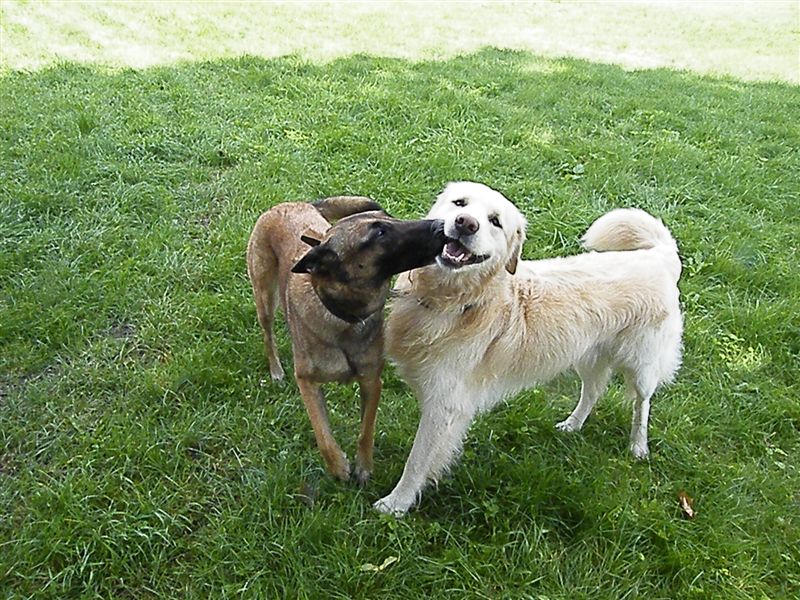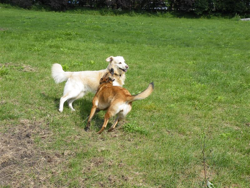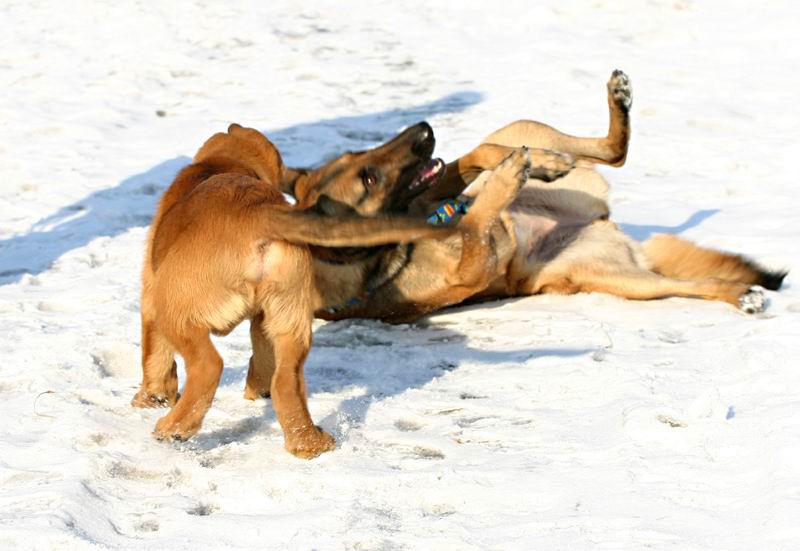 Gdy Vigo był szczeniakiem, suka kładła się przed nim na boku, upewniając malca, że może czuć się całkiem bezpiecznie. Ale już po trzech miesiącach Raszka bardzo wyraźnie okazywała, że należy jej się respekt i szacunek – popatrzcie na spokojne uszy młodego psa, gdy biegnie za dorosłą suką i na zupełnie inny wyraz pyska i uszu, gdy to ona go ściga.
